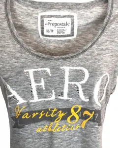Playera Aéropostale Varsity 87. Playera Aéropostale gris con estampado y bordado con brillos.