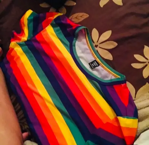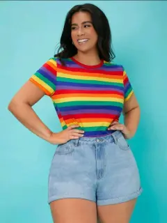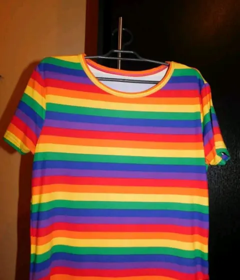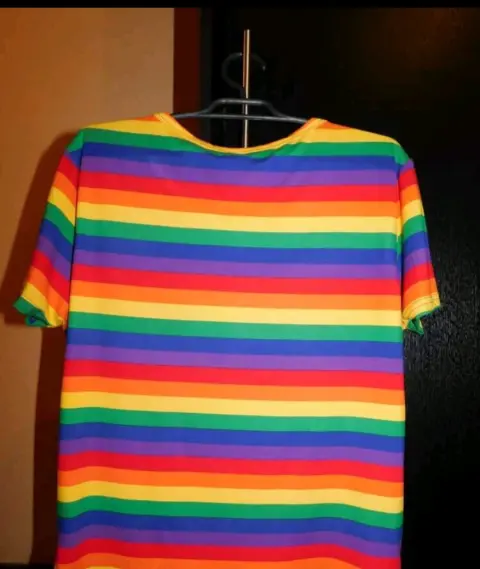 Bonita playera con los colores de arcoiris, en la etiqueta dice talla 4XL pero le va bien a una talla XG, la tela es muy suave y elástica