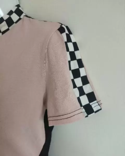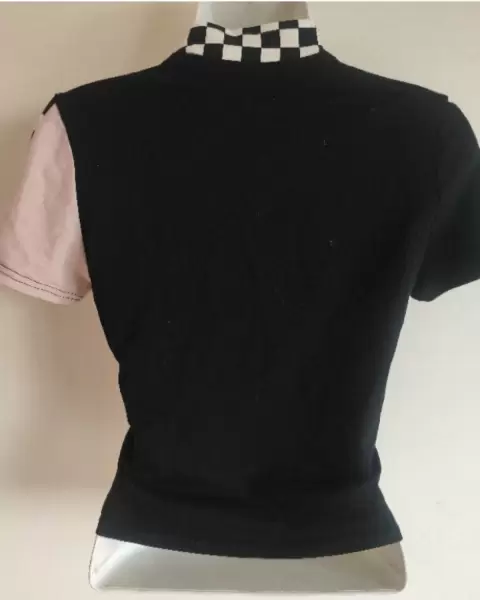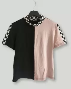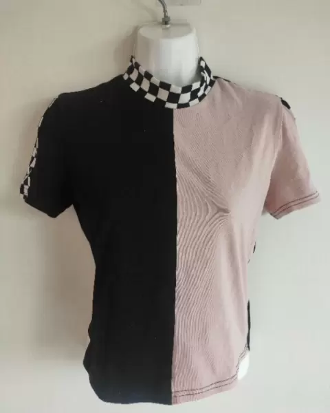 Playera bicolor con cuello de tortuga.Talla: M pero queda también bien a un S.Sin detalles.Tela: 95% algodón5% Spandex