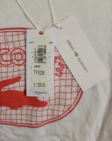 Playera sport blanca de la marca Lacoste con logotipo en color naranjaNueva y con etiqueta