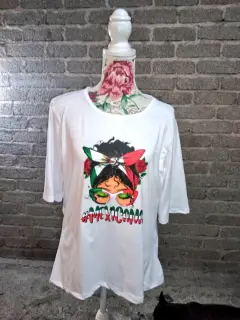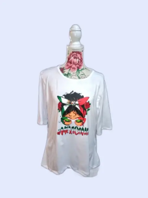 Playera blanca con cuello redondo manga al codo es de algodón licra es fresca talla L con estampado mexicano totalmente nueva