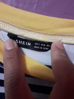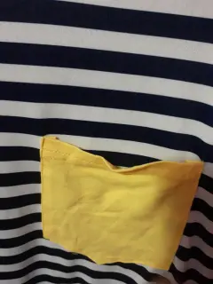 Playera de rayas color blanco azul marino y amarillo es talla chica pero yo también lo recomiendo hasta una talla grande sin ningún defecto