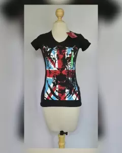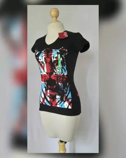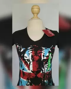 Playera Estampada estilo T-shirt. Playera estilo T-Shirt en color NEGRO ÉBANO c/estampado delantero tigre y bandera británica multicolor, cuello pico y manga corta. Por la composición de la tela es stretch. Talla G (REDUCIDA, da mejor a M). Dimensiones cms: 35 hombro, 43 axila, 39 cintura, 46 zona baja, 61 largo, 12 largo manga. 95% algodón, 5% elastano. P/lavado en casa.