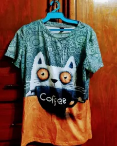 Playera estampada Gato. Playera estampada GatoMarca Shein, viene amplia, nueva, talla S. Material poliéster. Hombro 39 cm, pecho 94 cm, largo 62.5 cm, largo de manga 17.5 puño 30 cm