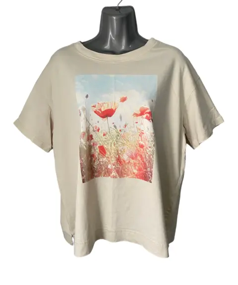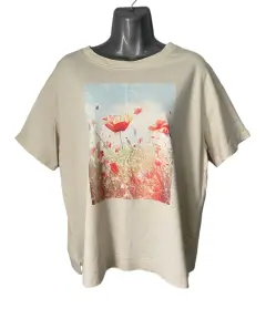 Playera beige estampada, es talla M pero viene amplia a una L100% algodón Medidas aproximadas De axila a axila 57 cm Largo 59 cm