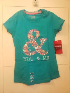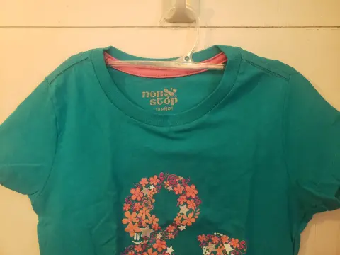 Descripción:Playera turquesaTalla: 10 añosEstampado con relieve de flores, estrellas y signos