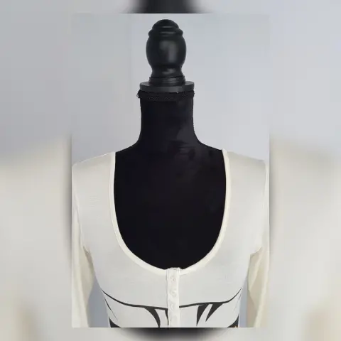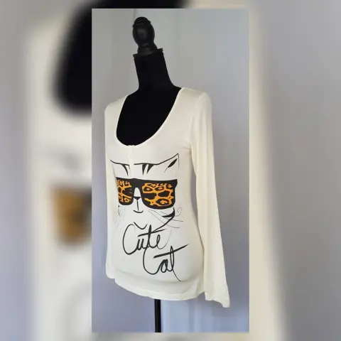 Playera estilo Crew Sweatshirt mod Last. Playera estilo Crew Sweatshirt en color CREAM modelo "Last" con estampado delantero y en tono NEGRO ÉBANO y TIGER, cuello redondo escote profundo y manga larga. Por la composición de la tela es stretch. Talla G. Dimensiones cms: 36 hombro, 47.5 axila, 40.5 cintura, 48.5 zona baja, 65 largo, 65 largo manga. 95% rayón, 5% spandex. P/lavado en casa.