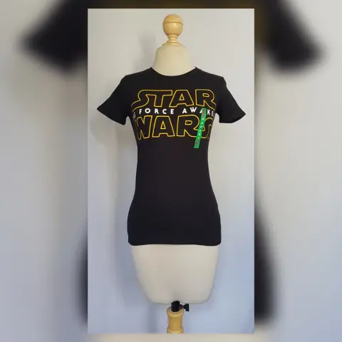 Playera estilo T-Shirt mod Star Wars. Playera estilo T-Shirt en color NEGRO ÉBANO modelo "Star Wars" c/estampado delantero AMARILLO MANGO/BLANCO POLAR, cuello redondo y manga corta. Por la composición de la tela es stretch. Talla G (REDUCIDA, da mejor a M). Dimensiones cms: 33 hombro, 45 axila, 41 cintura, 46 zona baja, 60 largo, 15 largo manga. 95% algodón, 5% elastano. P/lavado en casa.