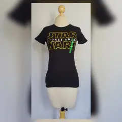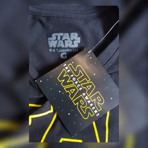 Playera estilo T-Shirt en color NEGRO ÉBANO modelo "Star Wars" c/estampado delantero AMARILLO MANGO/BLANCO POLAR, cuello redondo y manga corta. Por la composición de la tela es stretch. Talla G (REDUCIDA, da mejor a M). Dimensiones cms: 33 hombro, 45 axila, 41 cintura, 46 zona baja, 60 largo, 15 largo manga. 95% algodón, 5% elastano. P/lavado en casa.