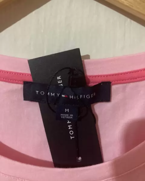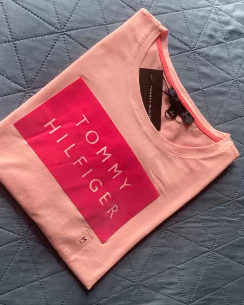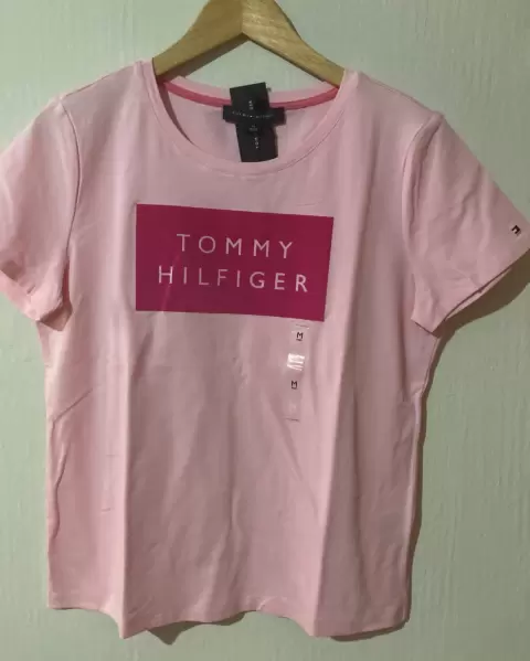 Playera rosa manga corta con letras de marca al frente tommy en talla mediana