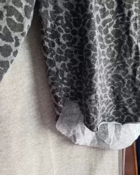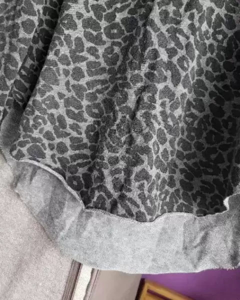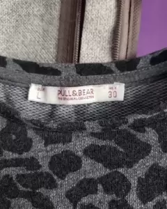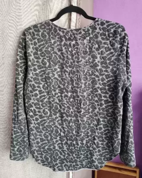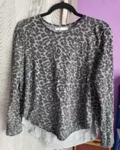 Playera gris con animal print. Talla M-L (30), en muy buen estado, manga larga, cuello redondo, la parte posterior es un poco más larga y en los laterales tiene aberturas, ajusta bonito al cuerpo, no transparenta para nada y la tela es algo calientita.