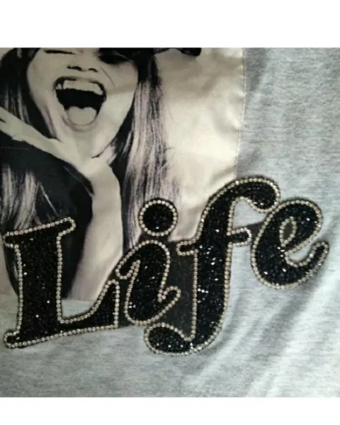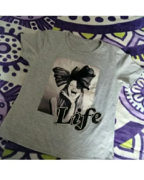 Playera gris estampada. Playera gris con estampado y detalles en el moño y piedras en las letras