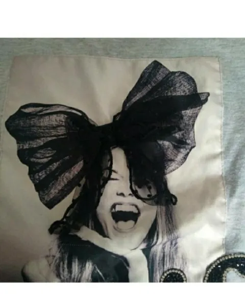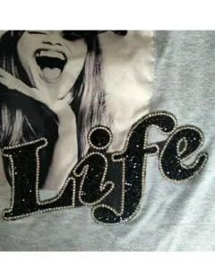 Playera gris con estampado y detalles en el moño y piedras en las letras