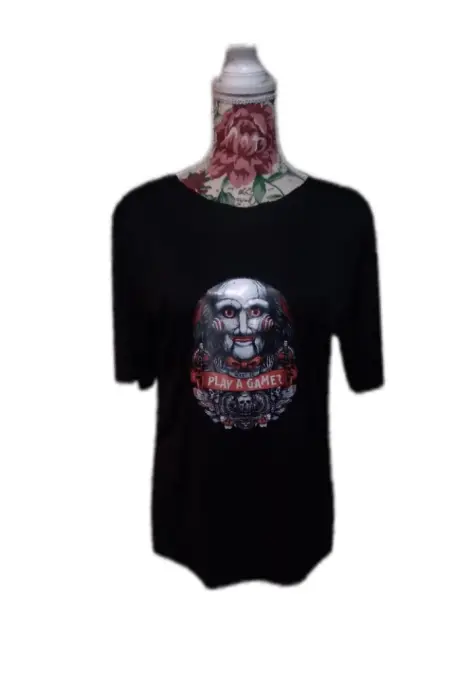 Playera negra en talla L de algodón con licra con estampado de saw juego del miedo, manga arriba del codo solo nos queda 1 pieza totalmente nuevo