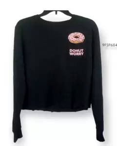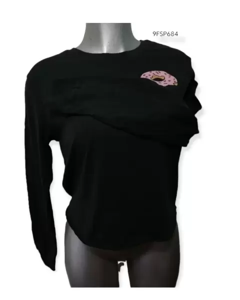 Playera negra estampado dona. Hermosa playera manga larga negra con estampado de dona, y una bolsa en el lateral superior. Medidas largo 53cm,axila a axila 49cm, largo Manga 62cm, hombro a hombro 43.5