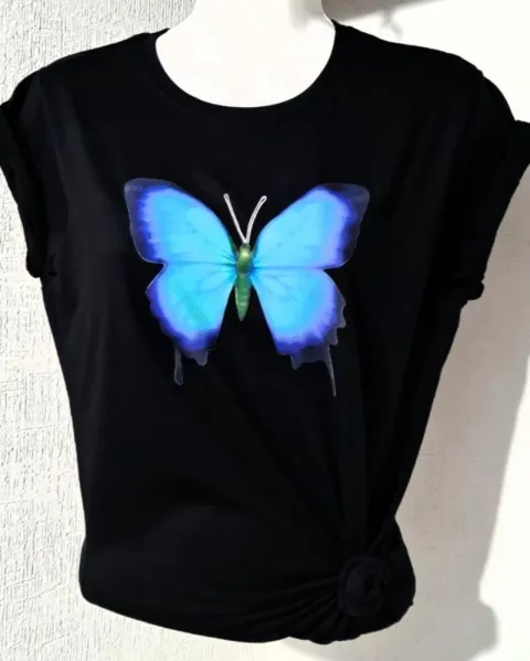 Playera negra de algodón con detalles en terciopelo con diseño de mariposa azul. Tela fresca y cómoda.