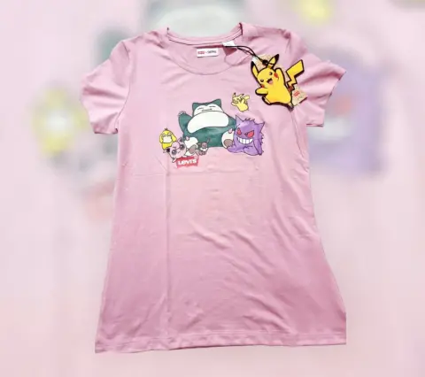 Playera para dama, marca Levi’s, aniversario pokemon, color rosa, talla m, con estampado pokemon al frente, cuello redondo y mangas cortas.