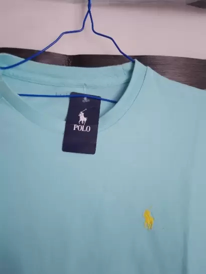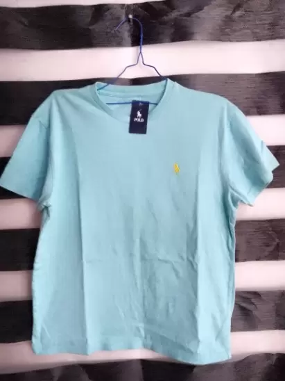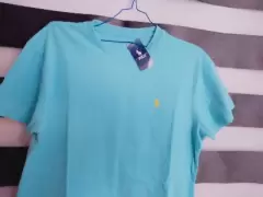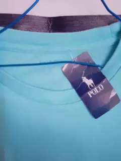 Playera azul, marca polo.Cuello en medio circulo Es talla M pero puede quedar con L y XLLa tela estira bastante.Sin ningún detalle