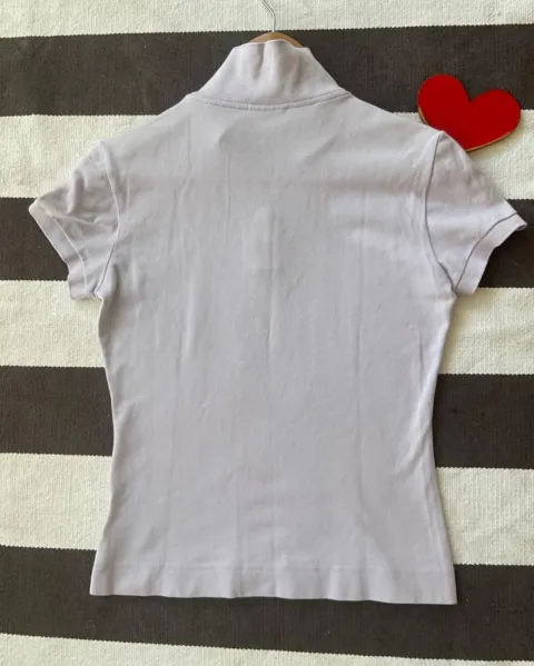 Playera tipo polo, color lila, 2 botones y manga corta. Talla: 38 (podría quedar a talla XS y S, ver medidas)Medidas: 38 cm hombros, 42.5 cm axila y 53 cm largo.Ligera decoloración.