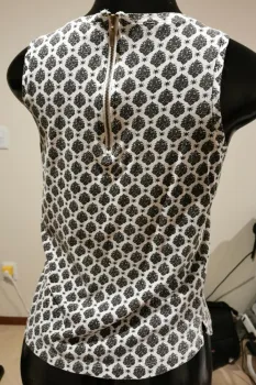 Playera sin manga blanco con negro. Playera blanca con estampado negro, cierre en la espalda, bolsa al frente
