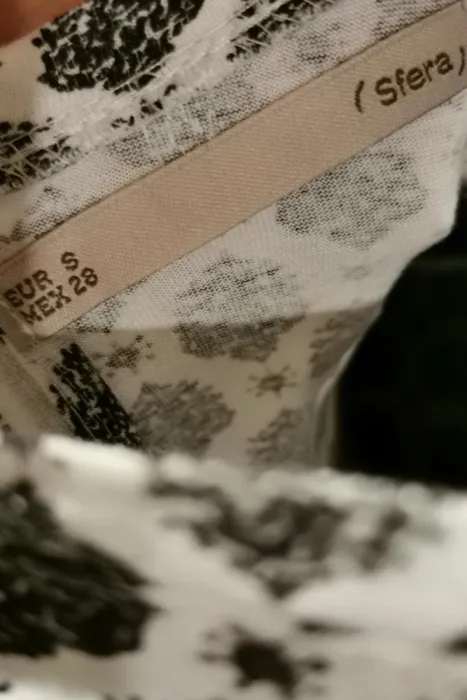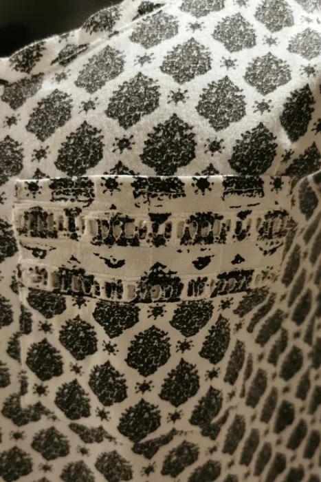 Playera blanca con estampado negro, cierre en la espalda, bolsa al frente