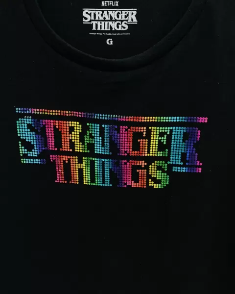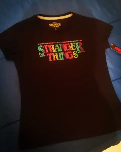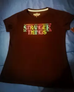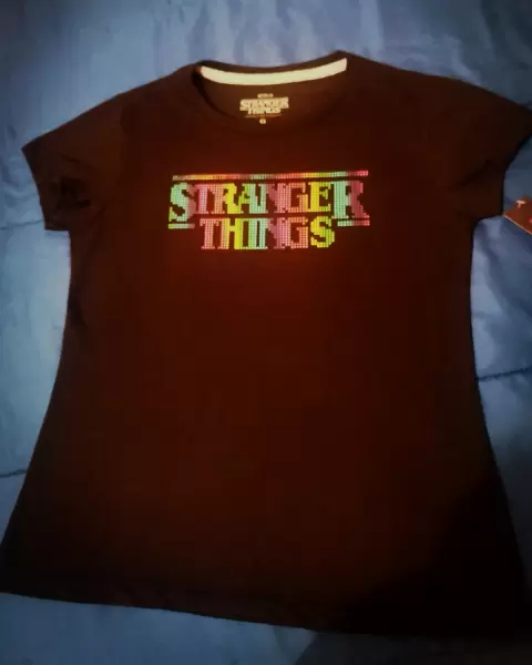 Bonita playera de moda de la serie Stranger Things con letras vistosas y coloridas talla G pero viene reducida. Totalmente nueva y con etiqueta!!!