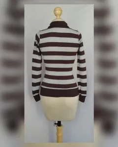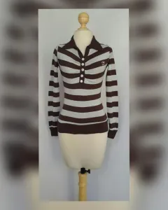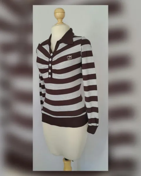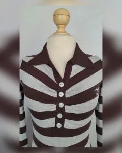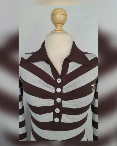 Playera stretch bitono TABACO/GRIS ÁCERO, cuello clásico c/solapas, botonadura de fantasía frontal y manga larga terminada en puño. UNITALLA ( da a S/M). Dimensiones cms: 34 hombro, 40 axila, 35 cintura, 31 zona baja, 55 largo, 63 largo manga. 100% acrílico. P/lavado en casa.***POR LA COMPOSICIÓN DE LA PRENDA, DA DE SI APROX 10 CMS, PERO NO PARA SUBIR A LA SIG TALLA***