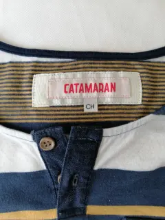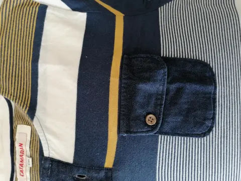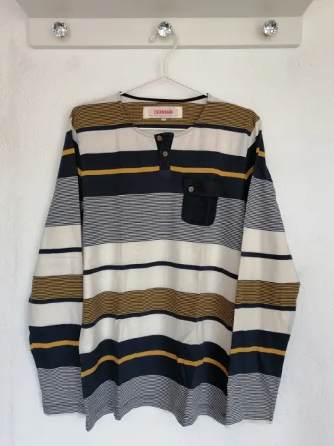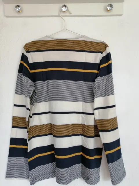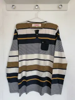 Playera manga larga. Y por el tamaño del torso puede fingir como blusón, es talla CH pero viene amplia. Rayada multicolor en azul marino, beige, y mostaza.