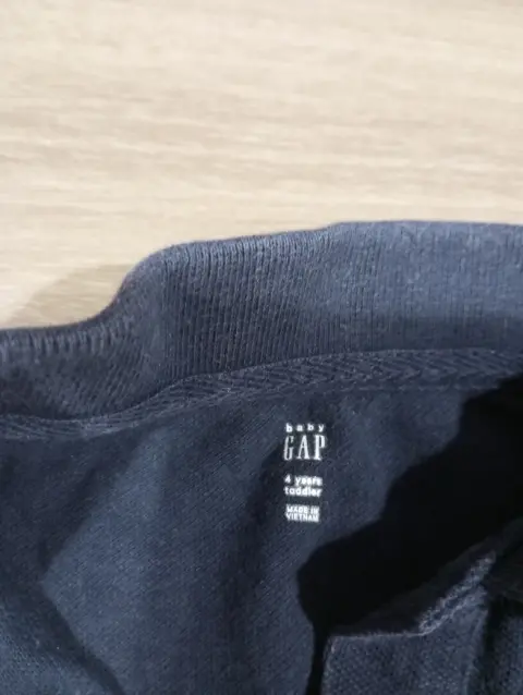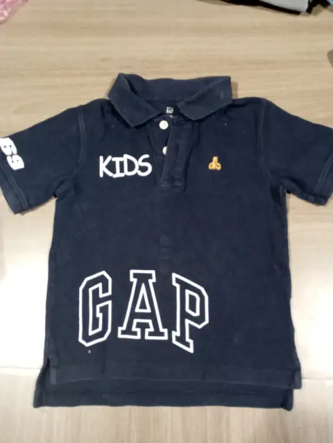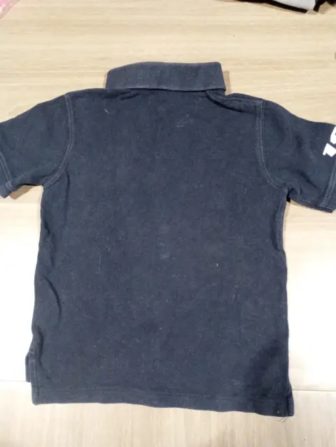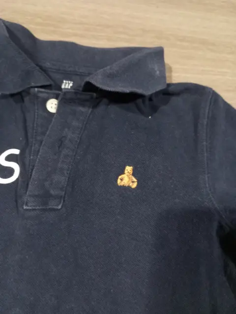 Playera tipo polo azul marino, tiene un pequeño oso bordado, y letras en color blanco. Talla 4 años