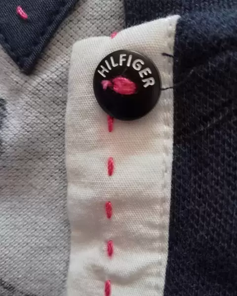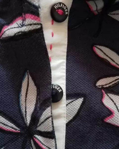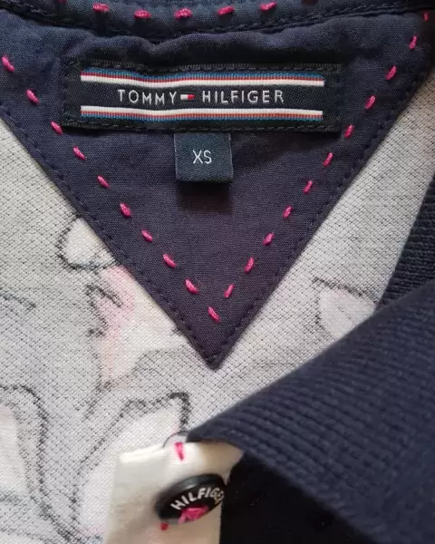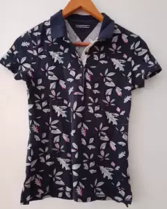 Playera TOMMY tipo polo, azul marino con flores blancas y tono rosado, MUY LINDA!! , nunca se usó y no tiene detalles, acabados distintivos de la marca, botones completos, es original adquirida en boutique. Envío rápido.