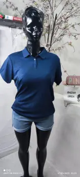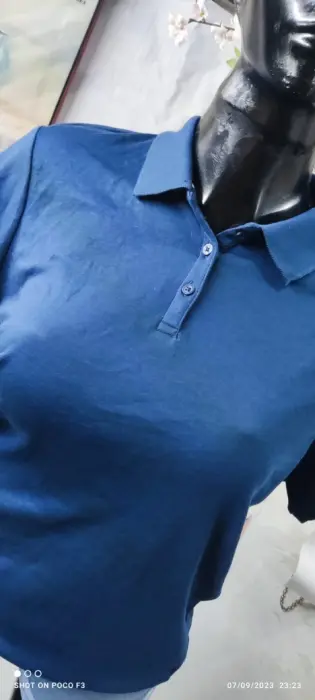 Playera tipo polo. Es color azul marino talla L (11-13) manga corta