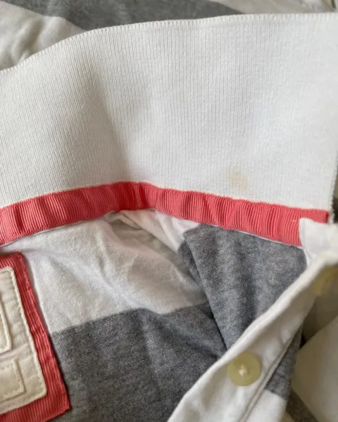 100% algodón, talla: S, manga corta, a rayas gris con blanco y detalles en rosa, 59 cm de largo, 38.5 cm de axila, 32.5 cm de hombro. En la última foto se ve la pequeña mancha en el cuello.