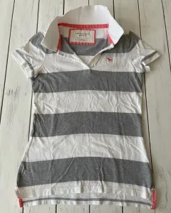 Playera tipo polo a rayas Abercrombie & Fitch. 100% algodón, talla: S, manga corta, a rayas gris con blanco y detalles en rosa, 59 cm de largo, 38.5 cm de axila, 32.5 cm de hombro. En la última foto se ve la pequeña mancha en el cuello.