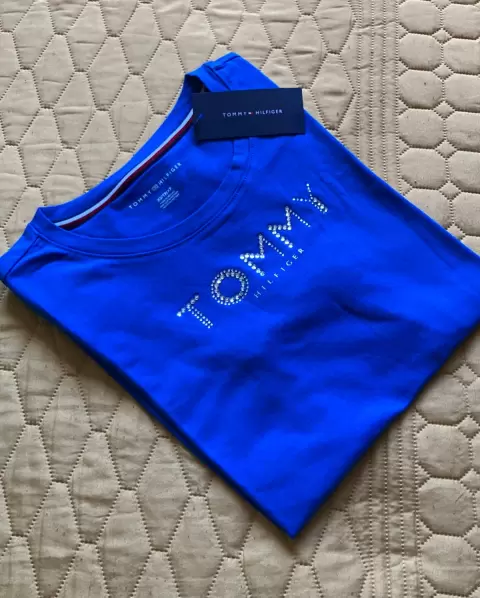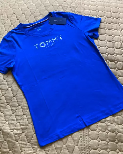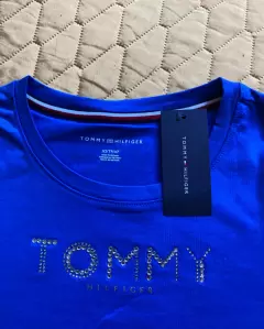 Playera tommy moderna. Playera tommy azul rey con letras de la marca al frente en brillos. Talla XS