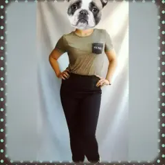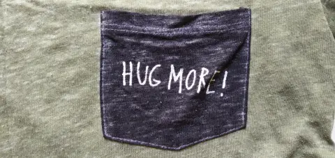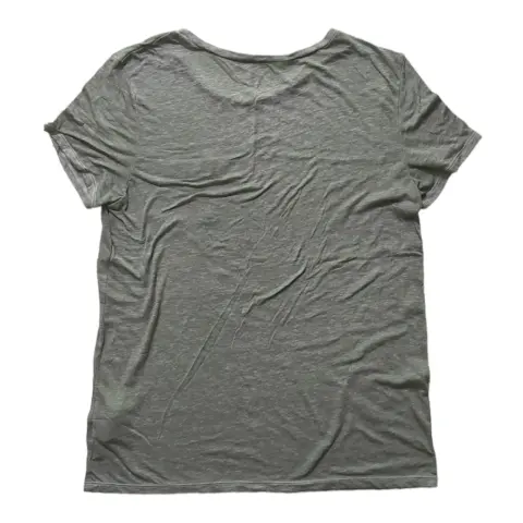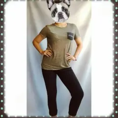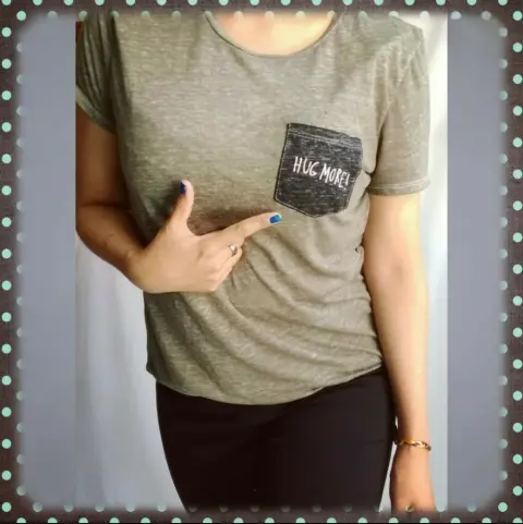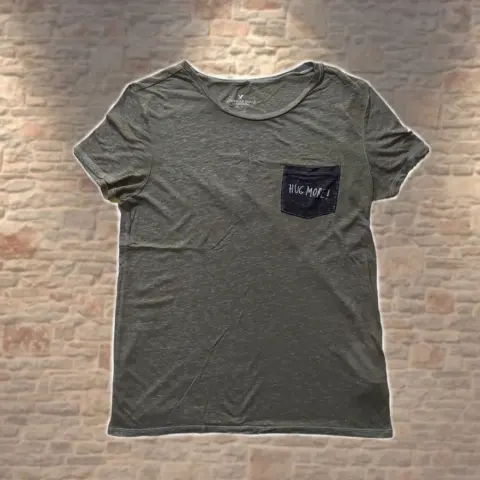 Playera verde militar con leyenda 'hug more' en bolsa frontal , marca American Eagle Outfitters, talla M. Compuesto de 63% poliéster y 27% algodón. Es muy fresca y estira. Sin detalles.MEDIDASHombro a hombro 42 cm.Axila a axila 45 cm.Largo total 65 cm.