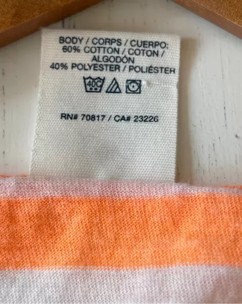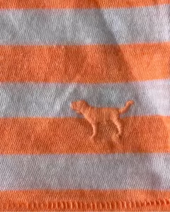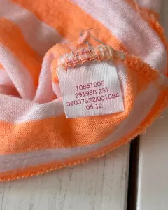 Talla: XSPlayera hecha en algodón y poliéster con espalda racerback a rayas blancas y naranja (el naranja se puede ver más fuerte en las fotos). Medidas: 33 cm de axila y 68 cm largo.