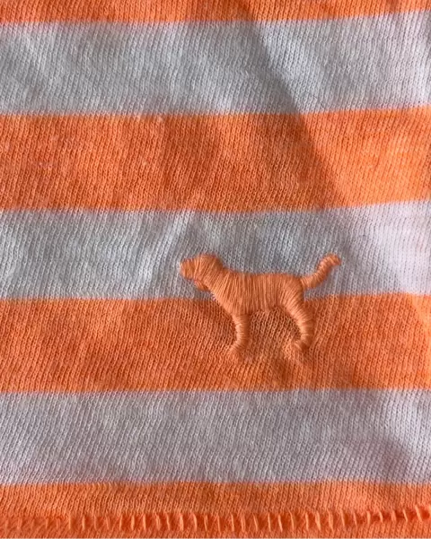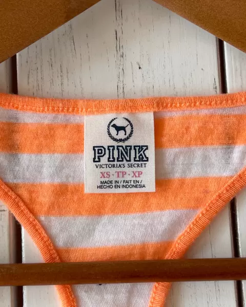 Tank top a rayas pink VS. Talla: XSPlayera hecha en algodón y poliéster con espalda racerback a rayas blancas y naranja (el naranja se puede ver más fuerte en las fotos). Medidas: 33 cm de axila y 68 cm largo.