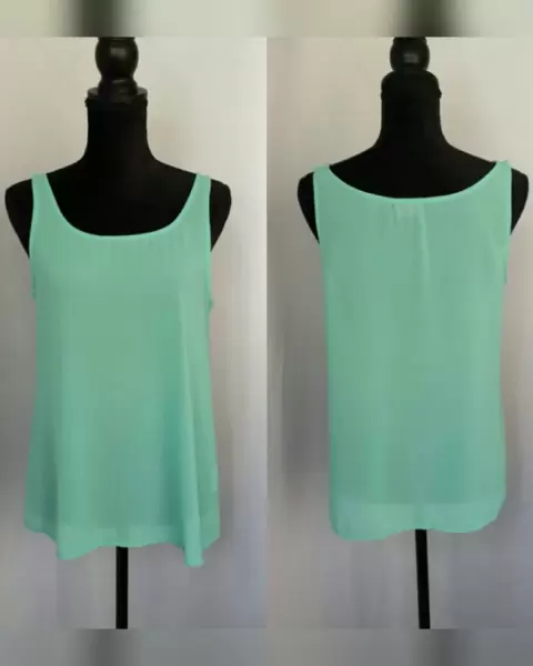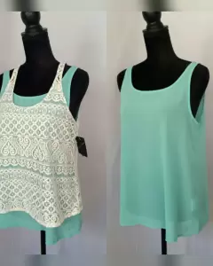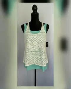 Tank Top doble Encaje/Tela. Blusa de encaje tipo tank top color MARFIL c/bies en contraste tono VERDE MENTA, cuello elíptico, sin mangas, cierre p/botonadura trasera. Cuenta con tank top adicional color VERDE MENTA para usar como fondo. Talla G. Dimensiones cms: Tank top encaje 24.5 hombro, 46 axila, 57 zona baja, 57 largo. Tank top 33 hombro, 49 axila, 58 zona baja, 56 largo. 100% poliéster. P/lavado en casa.
