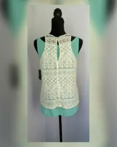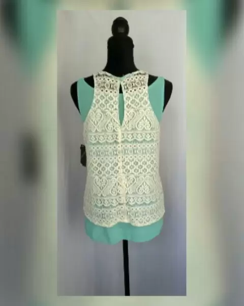 Blusa de encaje tipo tank top color MARFIL c/bies en contraste tono VERDE MENTA, cuello elíptico, sin mangas, cierre p/botonadura trasera. Cuenta con tank top adicional color VERDE MENTA para usar como fondo. Talla G. Dimensiones cms: Tank top encaje 24.5 hombro, 46 axila, 57 zona baja, 57 largo. Tank top 33 hombro, 49 axila, 58 zona baja, 56 largo. 100% poliéster. P/lavado en casa.