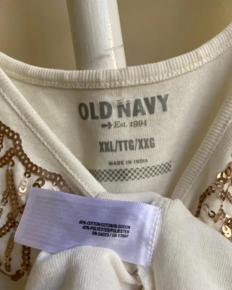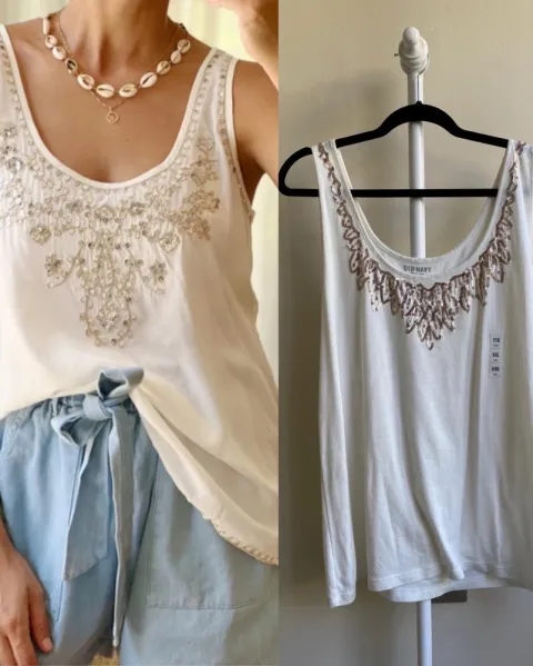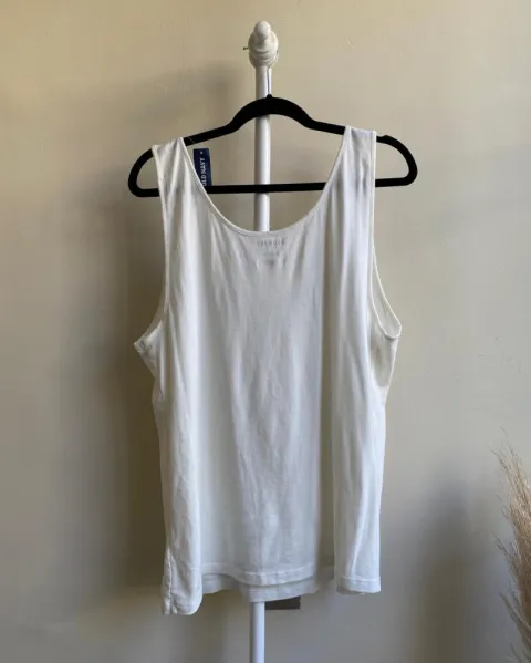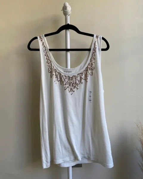 Tank top Old Navy.Talla 2XL, color blanco.Lentejuelas tejidas en escote color rose gold. Medidas en cm: axilas 54, largo 72, ancho bajo 59.La tela es stretch.