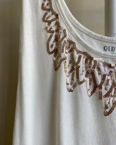 Tank top Old Navy lentejuelas. Tank top Old Navy.Talla 2XL, color blanco.Lentejuelas tejidas en escote color rose gold. Medidas en cm: axilas 54, largo 72, ancho bajo 59.La tela es stretch.