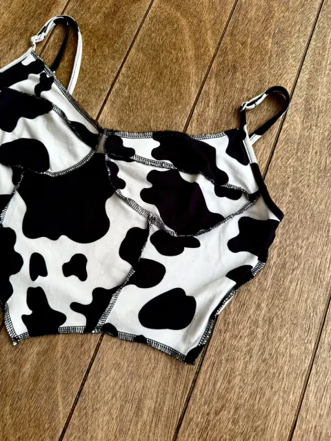 Top con diseño asimétrico que ayuda a que se marque más la cintura, con diseño de vaca. Los tirantes son ajustables, talla S. En perfecto estado y sin detalles!