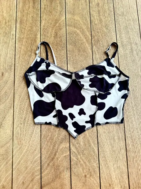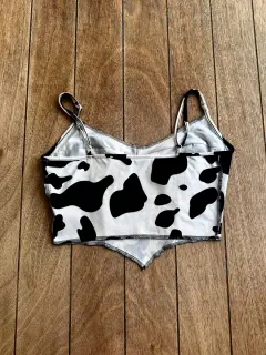 Top asimétrico de vaca. Top con diseño asimétrico que ayuda a que se marque más la cintura, con diseño de vaca. Los tirantes son ajustables, talla S. En perfecto estado y sin detalles!