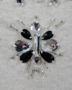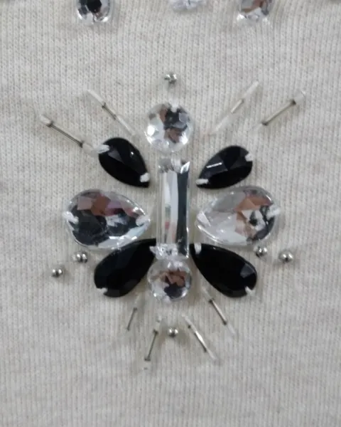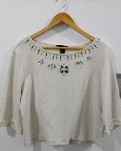 Top beige con cristales en el pecho, manga 3/4 ligeramente arremangada y cuello redondo. Talla M, sin detalles.