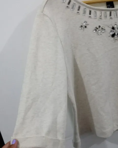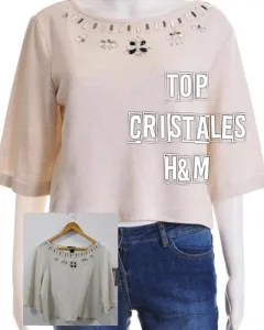 Top cristales H&M. Top beige con cristales en el pecho, manga 3/4 ligeramente arremangada y cuello redondo. Talla M, sin detalles.