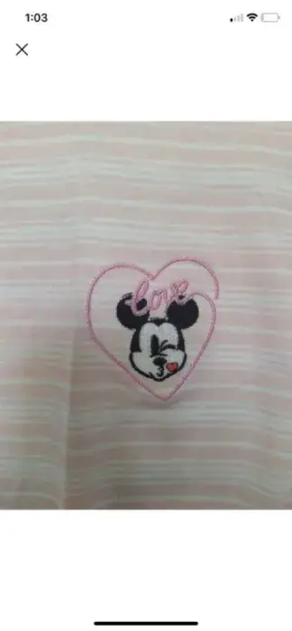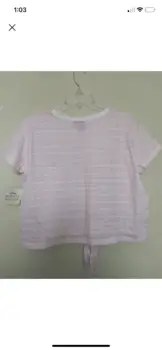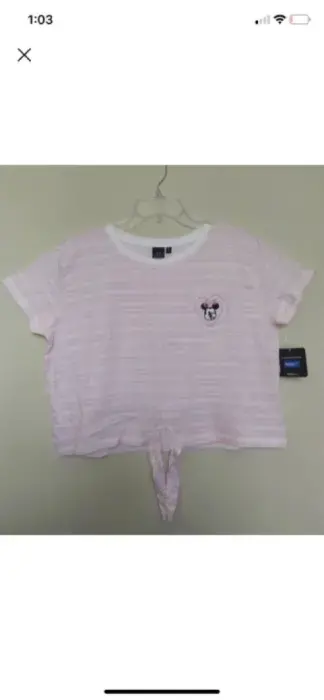Playera corta de Disney/Mickey mouse, su figura viene bordada, es color blanca con rayas rosa pastel.En la parte de abajo se ajusta con un nudo Medidas aproximadas:Pecho 116 cm Largo 53 cm