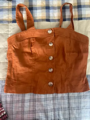Top naranja abotonado, da justo a la citura tipo crop top entallado no da de si, le queda bien a una chica talla S