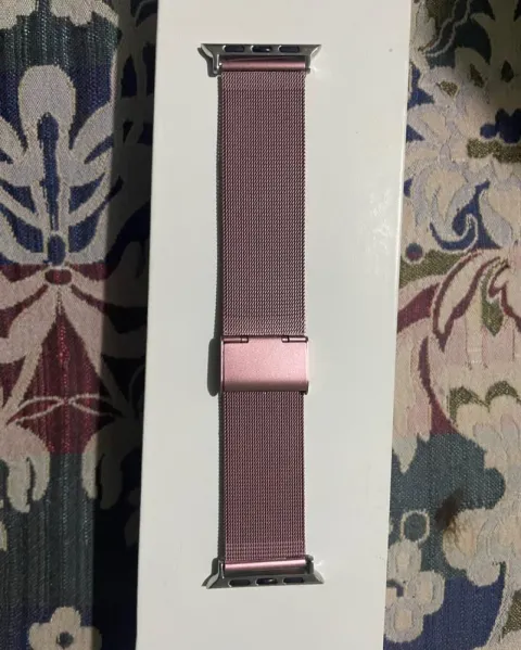 Funda con extensible para smartwatch y dos extensibles uno rosa metálico y otro azul, la medidas en la fotografía