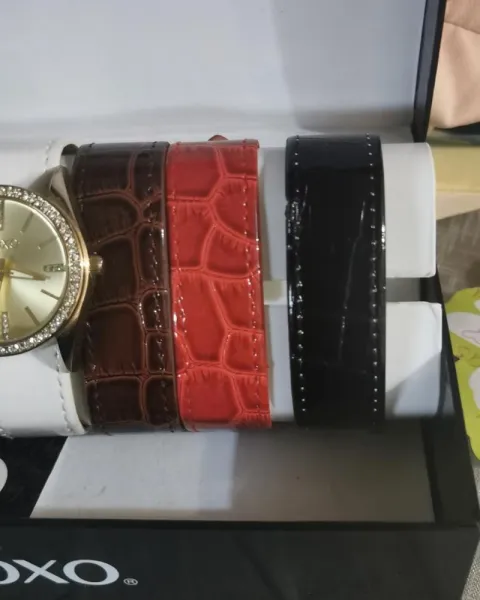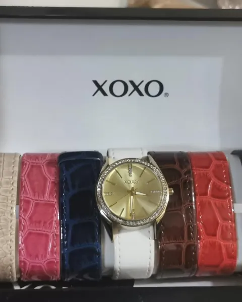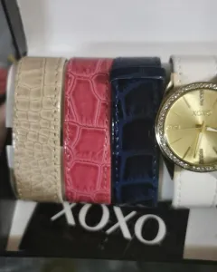 Set de reloj xoxo con multicorreas varios colores. Es producto nuevo en excelente estado. Una correa va de regalo no venia con el reloj, esa correa que va de regalo esta un poco quebrada de un costado. No afecta su uso. La agregue al set por que estaba en buen estado y era de un reloj que tuve antes de la misma marca y modelo.