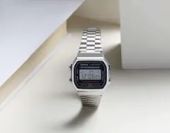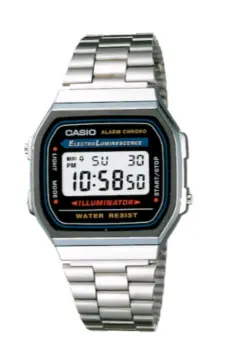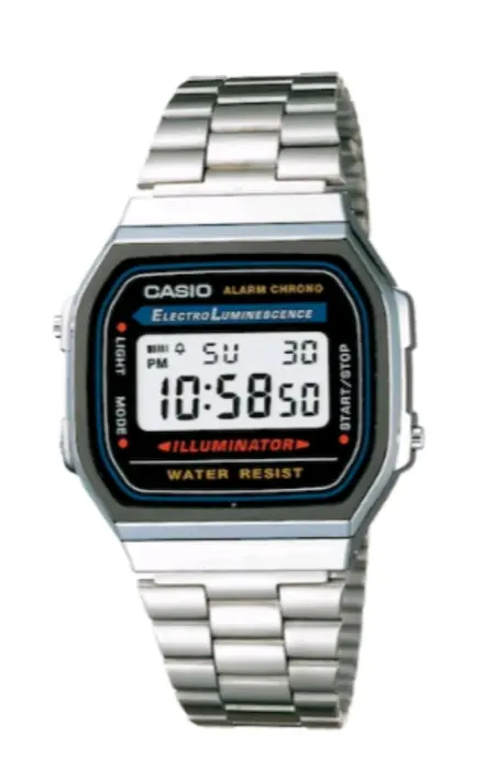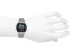 Reloj Casio A168WA-1Q Plateado. Es un modelo digital, resistente al agua, además, la pila te puede durar hasta 7 años. Ofrece funciones básicas de la marca como cronómetro y alarma. Cierra con un extensible de acero inoxidable.Sin duda, es el accesorio perfecto para acompañar tus atuendos